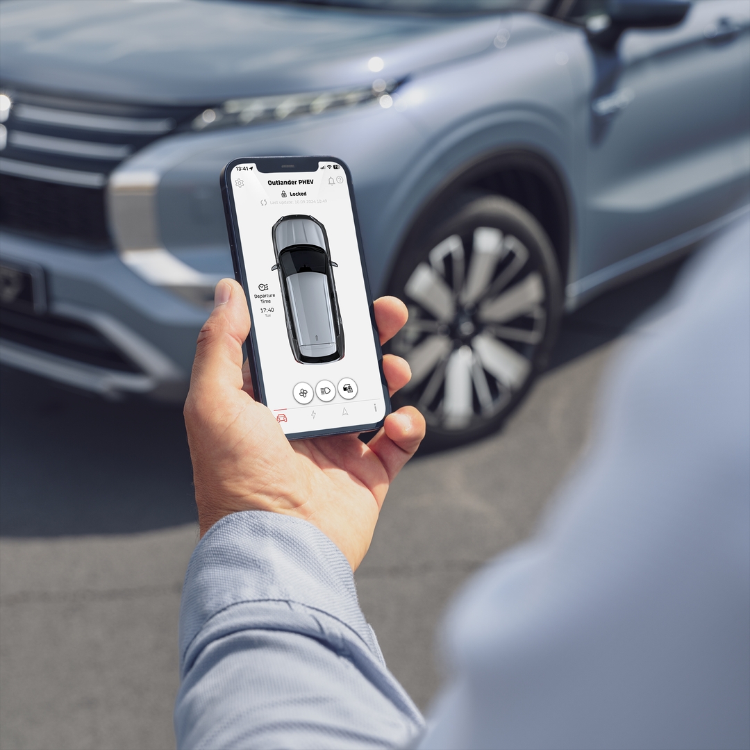 Noul Outlander PHEV te conectează la vehiculul tău prin intermediul aplicației Mitsubishi Motors, permițându-ți să controlezi motorul, clima și încărcarea EV de la distanță. Rămâi informat cu privire la starea vehiculului și primești alerte inteligente oriunde ai merge.