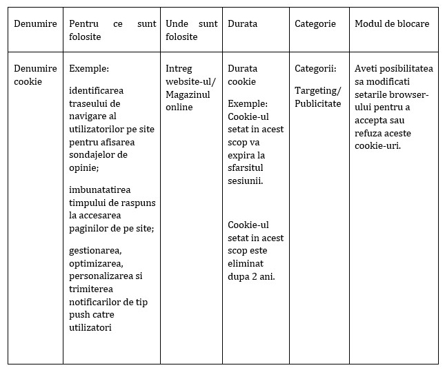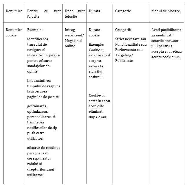 Aceasta politica privind utilizarea cookie-urilor este conceputa pentru a va informa in legatura cu practicile noastre in ceea ce priveste colectarea de informatii de la dvs. atunci cand vizitati site-ul nostru, prin intermediul cookie-urilor si a altor tehnologii de urmarire, insa cu respectarea dreptului dvs. la protectia datelor cu caracter personal care va privesc.