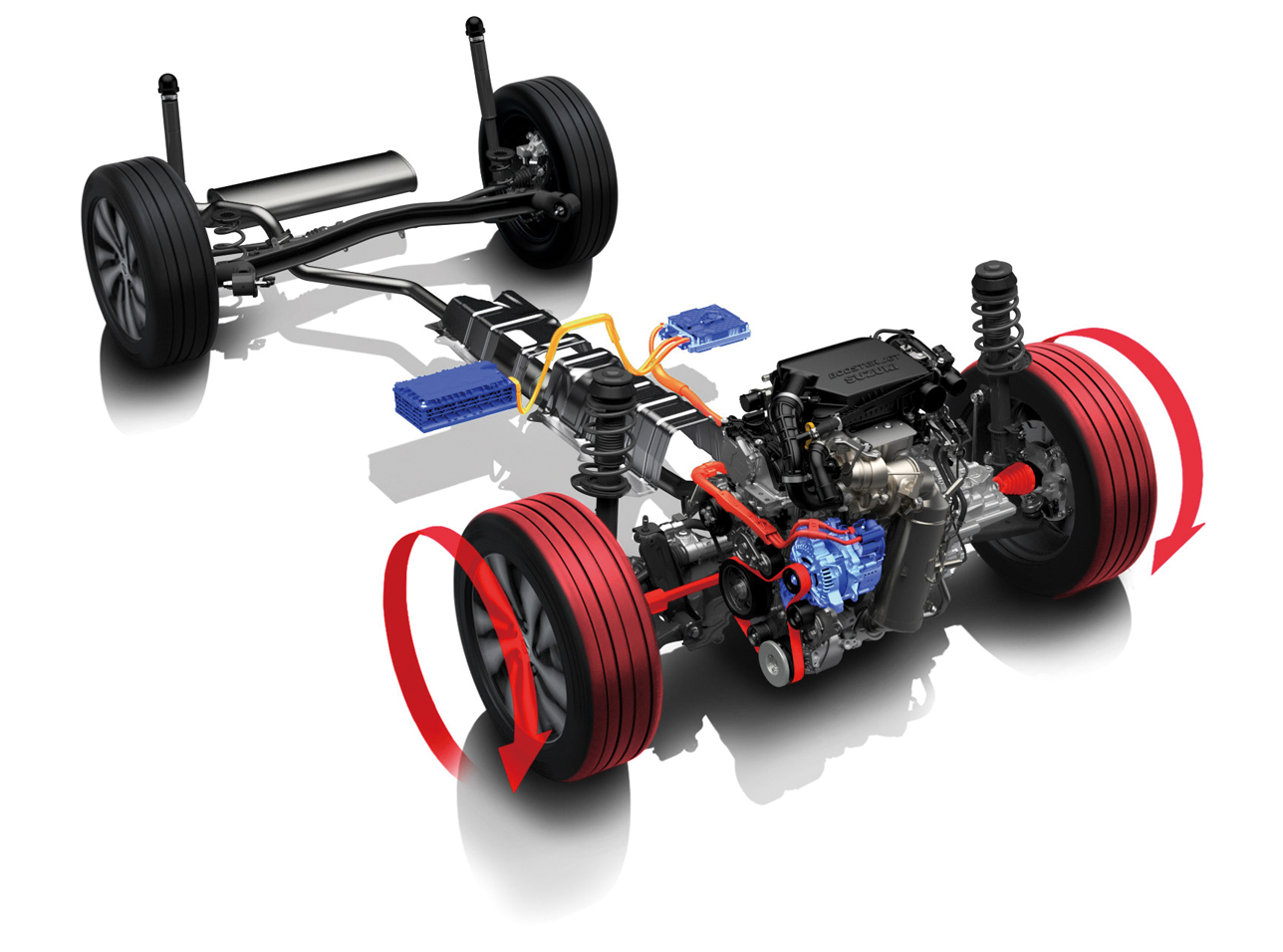 Sistemul mild hybrid SHVS de 48V utilizează un generator de pornire integrat (ISG) de 48V cu funcție de motor electric, o baterie litiu-ion de 48V și un convertor DC/DC de la 48-12V. Prin operarea la o tensiune de alimentare mai mare decât cea standard de 12V, acest sistem maximizează energia regenerată în timpul decelerării și sprijină motorul electric pentru a reduce consumul de combustibil și a îmbunătăți performanța vehiculului. În condiții normale de condus, sistemul prioritizează eficiența consumului de combustibil, iar în situații în care se solicită accelerație rapidă, motorul electric adaugă cuplu motorului principal prin utilizarea uneia dintre cele două funcții (controlul umplerii cuplului sau creșterea cuplului). În plus, motorul electric poate menține motorul în relanti și poate elimina consumul de combustibil în timpul decelerării pentru a maximiza eficiența consumului de combustibil, cu excepția momentelor când aparatul de aer condiționat este activ sau nivelul de putere rămas al bateriei este de 3 sau mai mic.