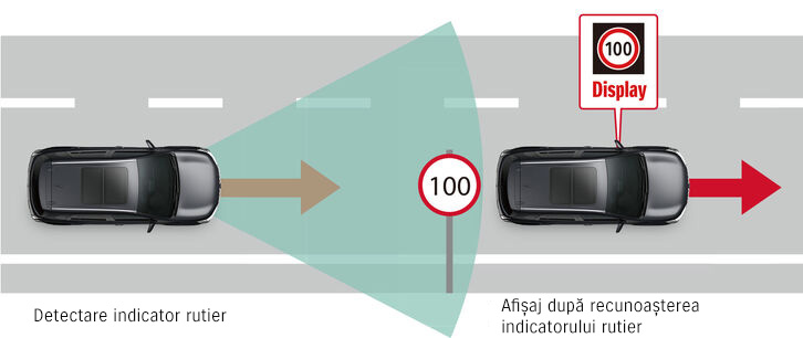 Funcția de recunoaștere a indicatoarelor rutiere detectează și identifică semnele de circulație cu ajutorul camerei monoculare și le afișază pe tabloul de bord al vehiculului. Aceasta funcție poate fi utilizată alături de funcția de avertizare a depășirii limitei de viteză pentru îmbunătățirea experienței de condus și siguranță în trafic.
