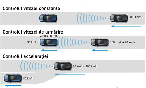 În cazul în care nu există vehicule în față, se menține viteza stabilită de șofer.