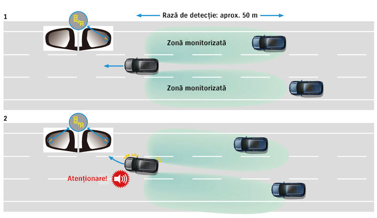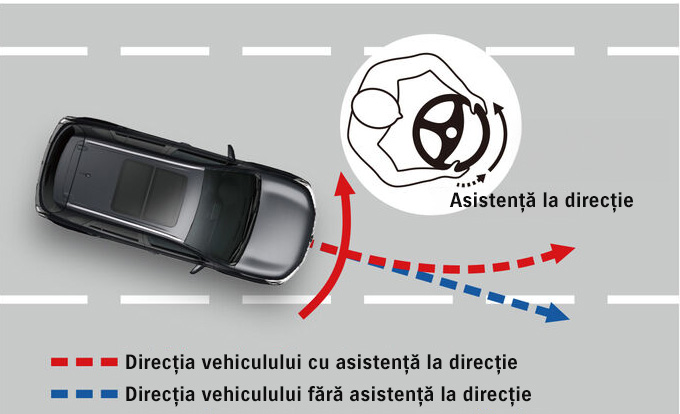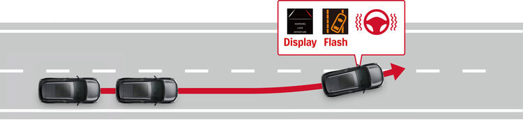 În timpul rulării, sistemul detectează liniile de demarcație ale benzilor de circulație din stânga și din dreapta și prezice traiectoria vehiculului. În cazul în care vehiculul se îndreaptă neintenționat spre marginile benzii de circulație, sistemul avertizează șoferul prin semnale acustice și vibrații în volan.