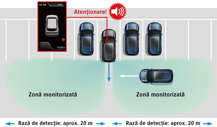 RCTA este o funcție de siguranță suplimentară care utilizează senzori radar pentru a detecta și a te avertiza că se apropie vehicule din stângă sau din dreapta atunci când te deplasezi în marșarier dintr-un loc de parcare sau dintr-un garaj.
