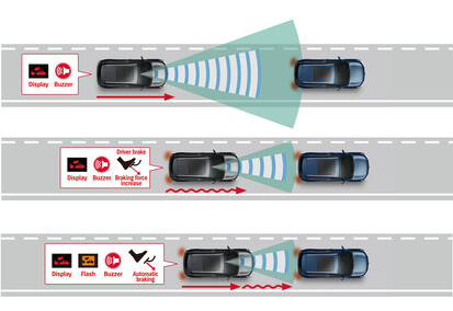 Sistemul ultilizează radarul cu unde milimetrice și o cameră monoculară pentru a detecta vehiculele, bicicletele și pietonii aflați în fața sau în diagonala față a vehiculului. În situațiile în care există riscul unei coliziuni, șoferul este alertat prin intermediul unor semnale acustice și vizuale. Dacă șoferul nu frânează cu forță suficientă, sistemul de asistență la frânare se activează automat pentru a înceti vehiculul. În cazul unei coliziuni iminente, sistemul aplică automat forța de frânare pentru a reduce impactul și a minimiza daunele.