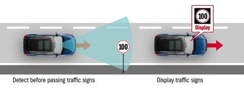 Funcția de recunoaștere a semnelor de circulație afișează semnele de circulație recunoscute de o cameră monoculară pe afișajul de informații. Aceasta poate fi folosită împreună cu funcția de alertare a depășirii limitei de viteză de pe tronsonul respectiv de drum.