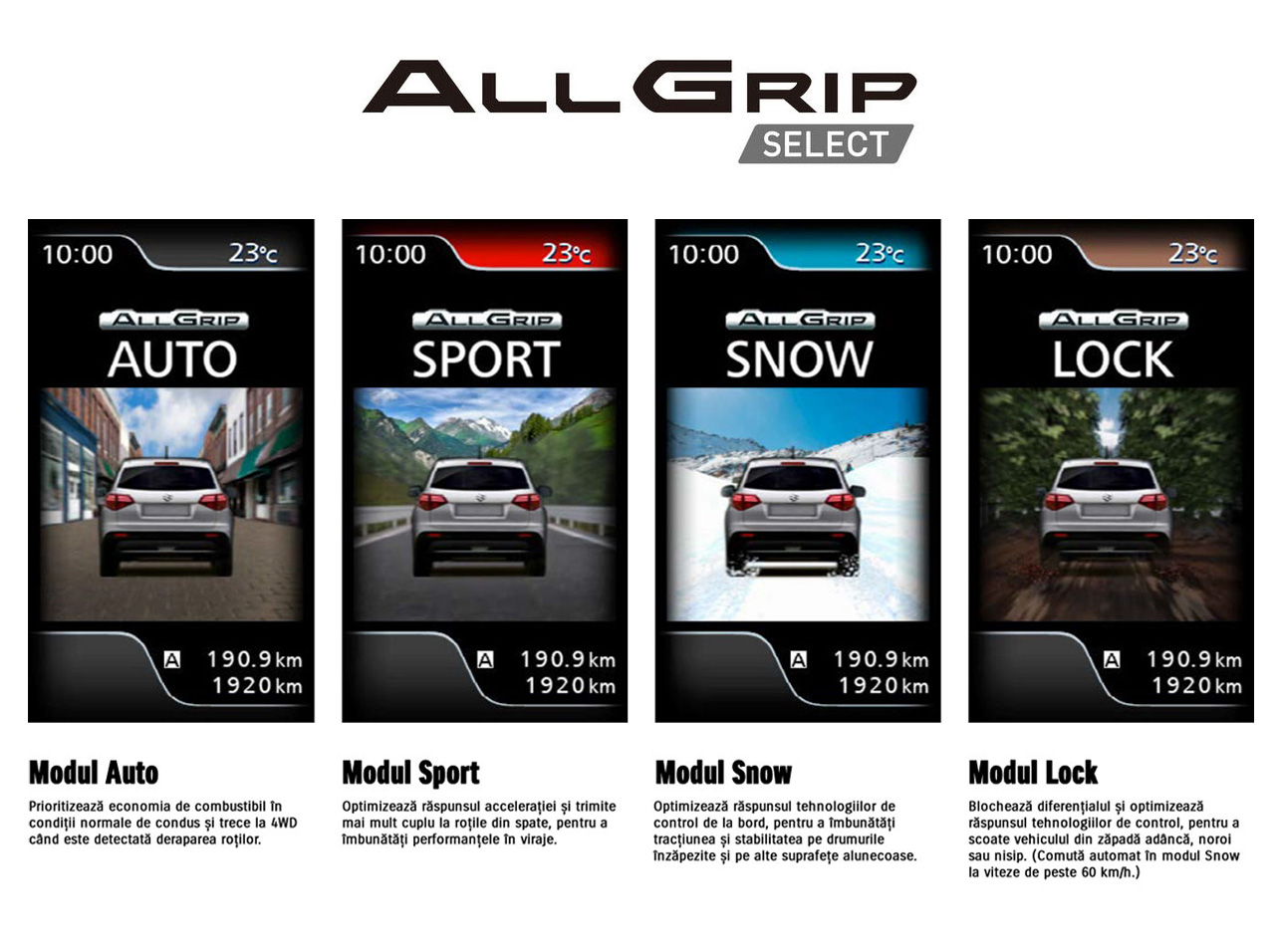 ALLGRIP SELECT vă permite să alegeți între modurile de condus: Auto, Sport, Snow și Lock printr-un simplu buton în centrul consolei. Pentru o confirmare ușoară, modul selectat este afișat pe display-ul de pe panoul de bord.